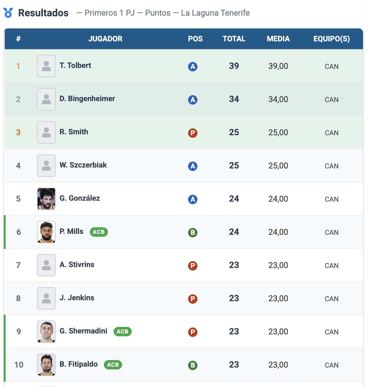 Esos 24 puntos anotados suponen el quinto registro más alto de un jugador en ACB con la camiseta del CB Canarias, igualando al mítico Germán González que, recordemos, dejó hace unos días de ser el máximo anotador histórico del club tras ser superado por Gio Shermadini.