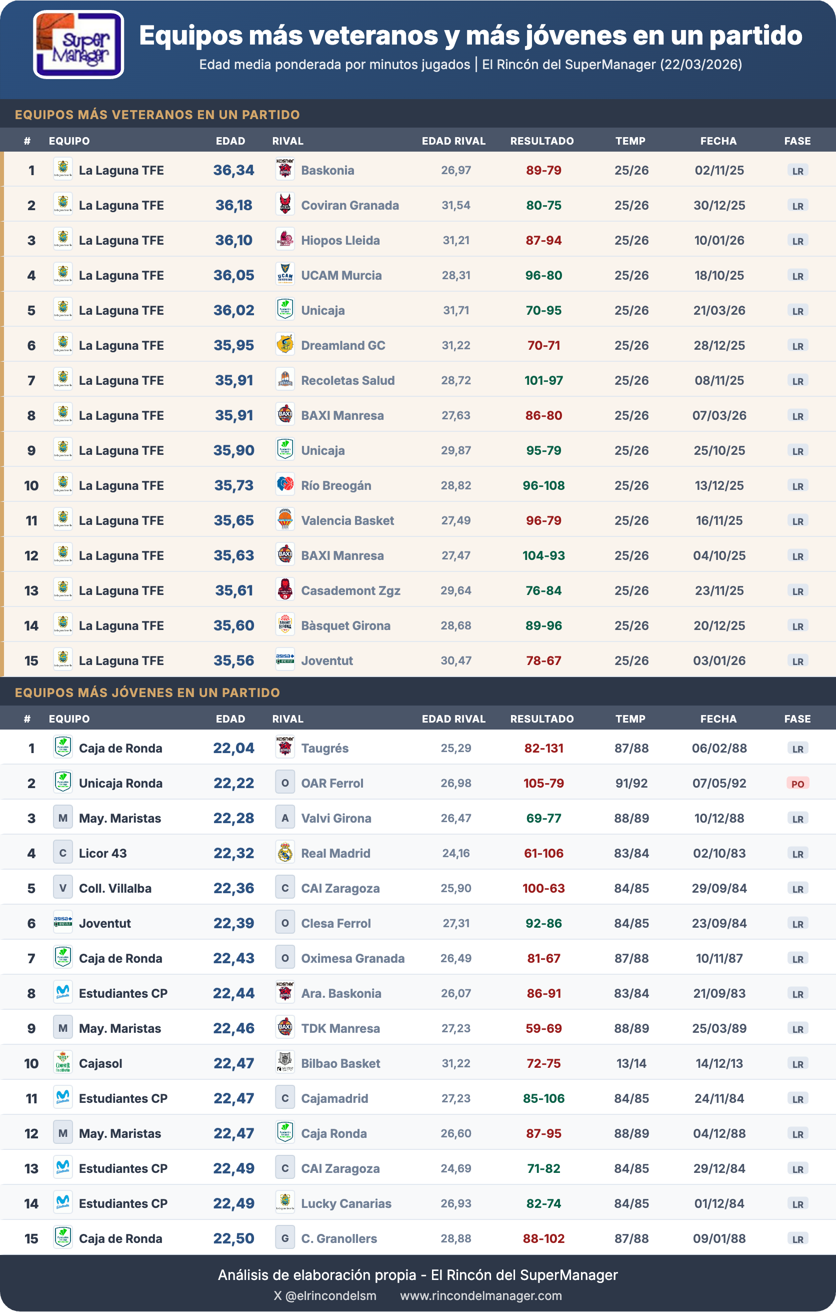 Un veterano debutando en un equipo de veteranos. No en vano, la actual plantilla del equipo de La Laguna es la más vetarana de la hsitoria de la competición, promediando casi 35 años y medio (promedio ponderado por minutos disputados). De hecho, el partido de Málaga se mete en el top 5 de partidos históricos por veteranía, con 36,02 años.