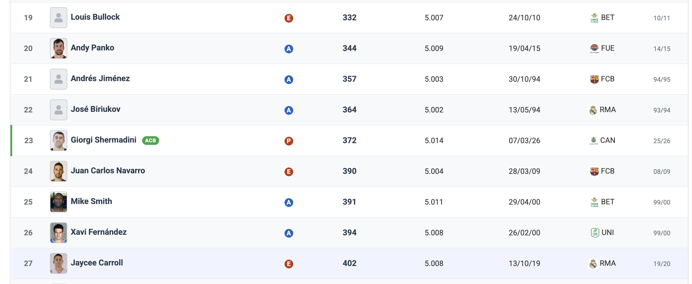 Shermadini ha superado a Germán González, alero albaceteño del Cajacanarias que sumó 3.191 puntos en las 5 temporadas que disputó con el equipo aurinegro a finales de los 80 y principios de los 90. Les acompaña en el podio otro jugador en activo, el brasileño Marcelinho Huertas, con 3.111, incluyendo los 20 de hoy.