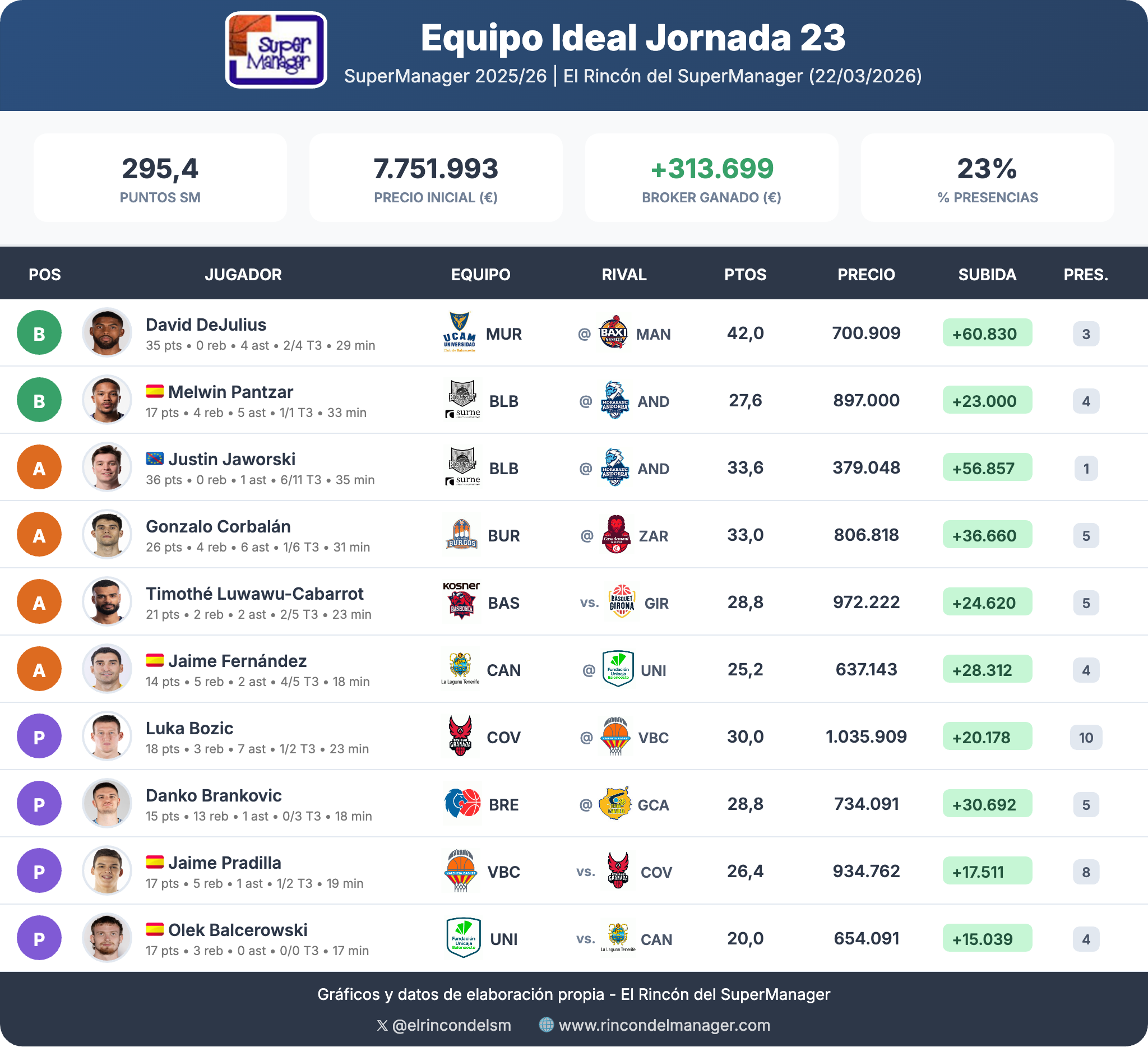 DeJulius y Jaworski, las dos puntuaciones más altas de la jornada, son también, curiosamente, los jugadores con menos presencias acumuladas en el equipo ideal. El resto de jugadores que completan el de la J23 han sumado ya 4 o más presencias. Destacan las 10 de Luka Bozic, 2ª consecutiva y repitiendo contra Valencia Basket, que le sitúan como el jugador con más jornadas en el equipo ideal de todo el juego.