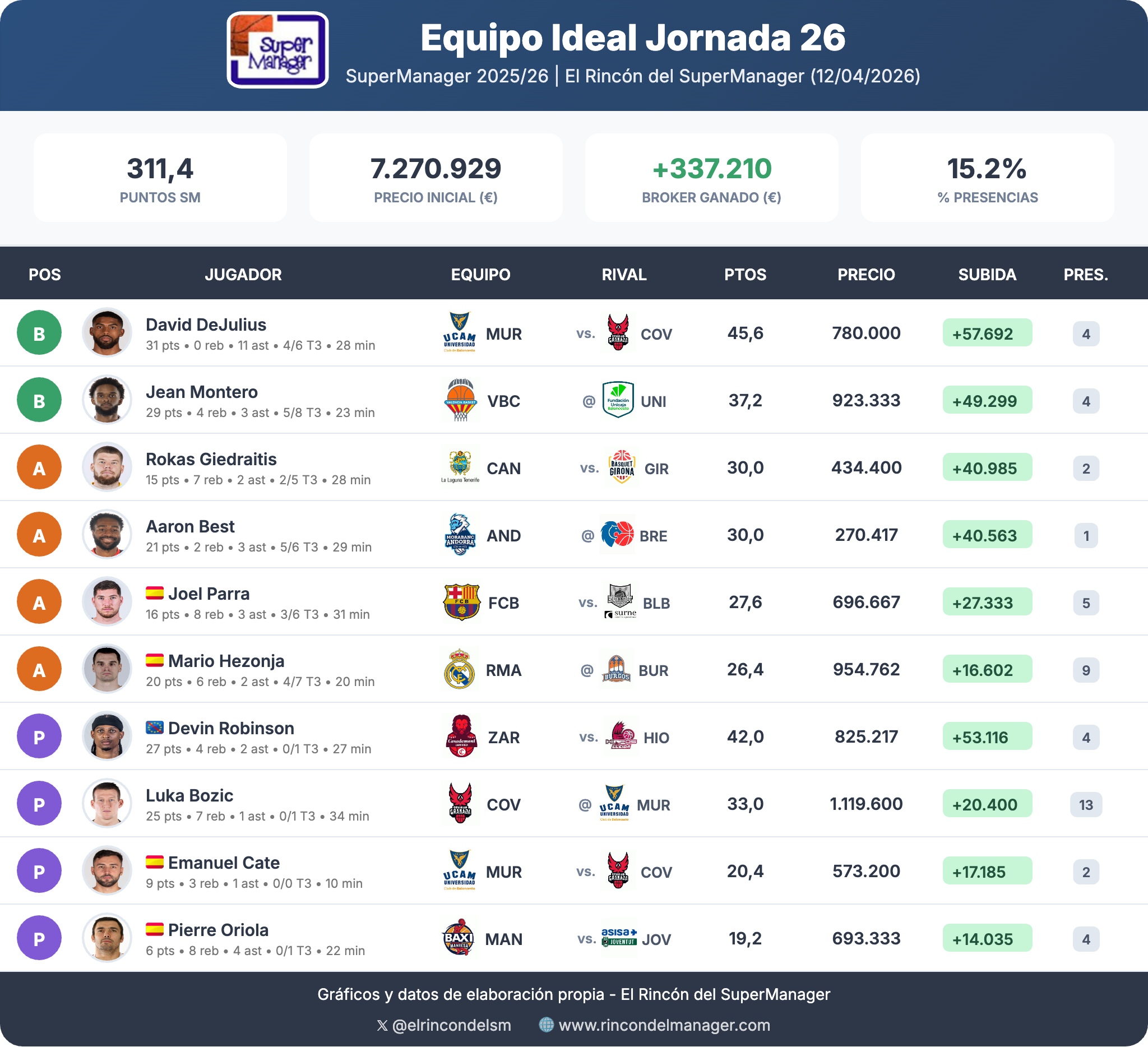 Que Luka Bozic aparezca en el equipo ideal de la jornada del SuperManager acb no es ya sorpresa para nadie. El croata del Covirán Granada suma ya trece apariciones en las 26 jornadas disputadas, las cinco últimas de forma consecutiva. Es el jugador de la temporada en el juego, habida cuenta de que sus perseguidores, Jaime Pradilla y Mario Hezonja, ambos con la ventaja de contar con bandera de JFL (Jugador Formado Localmente), suman "apenas" nueve cada uno.