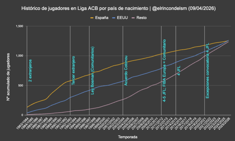 Mientras trabajábamos en el Mapamundi de jugadores ACB, nos hemos topado con un dato tan curioso como predecible: la ACB, desde su fundación en 1983, ya ha visto debutar a más jugadores nacidos en Estados Unidos que en España. Aunque la diferencia es mínima - con los datos con los que contamos en el momento de redactar este artículo 1.257 frente a 1.256 - lo cierto es que la tendencia de los últimos años nos anticipa que va a ir a más.