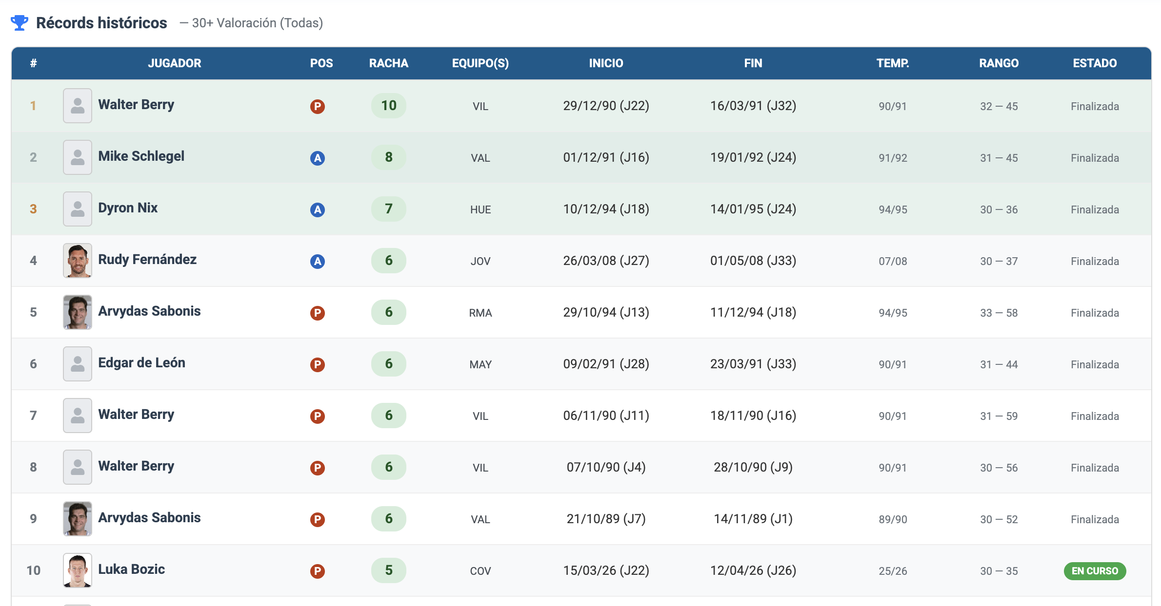 Pero es que, aunque nos vayamos más atrás en el tiempo, no será fácil encontrar demasiados precedentes. En una Liga ACB en la que los equipos jugaban prácticamente 40 minutos con el quinteto inicial, Walter Berry encadenó hasta 10 partidos sin bajar de la treintena. Es el racha más larga de la historia de la liga. Al margen de él y de Rudy, sólo Dyron Nix, Arvydas Sabonis y Edgar de León consiguieron rachas más largas que la que actualmente tiene abierta el croata de Covirán.