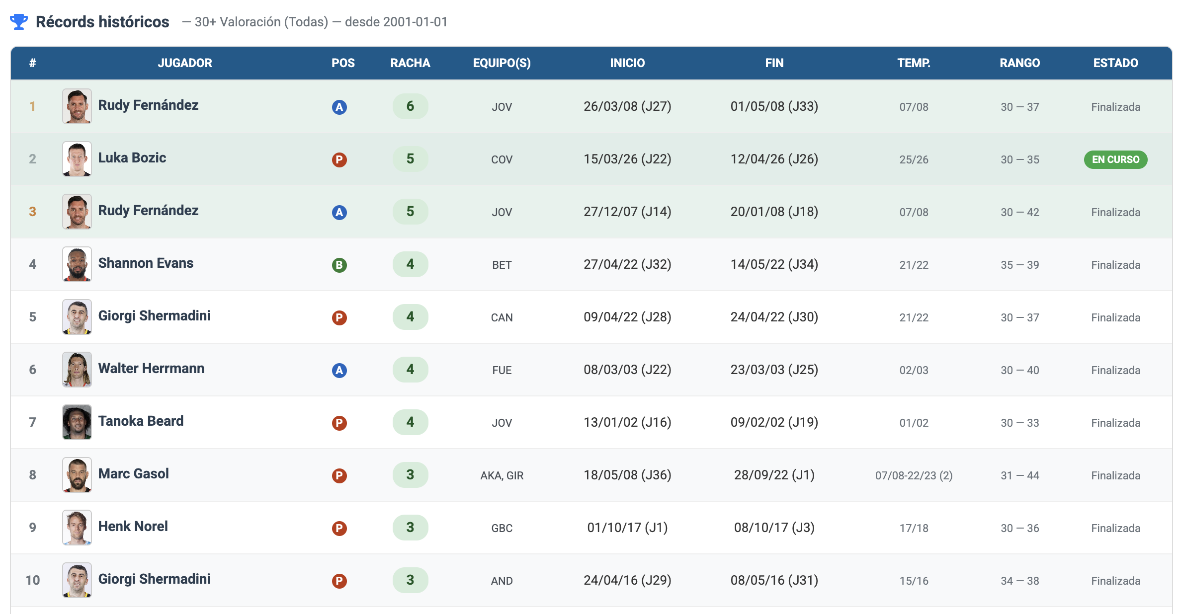 Lo insólito de la situación es que, en todo el siglo XXI, únicamente otro jugador había conseguido enlazar cinco partidos consecutivos con 30+ créditos. Fue Rudy Fernández, quien lo consiguió en dos ocasiones en una misma temporada, la 2007/08, con la camista del Joventut Badalona. Primero fue entre las jornadas 14 y 18, firmando cinco partidos entre 30 y 42 de valoración, para luego mejorar la racha entre las jornadas 27 y 33 (6 en total). Ni Curtis Borchardt, ni Luis Scola, ni Marc Gasol, ni Felipe Reyes, ni Walter Herrmann, ni Tanoka Beard, ni nadie. Sólo Rodolfo Fernández y Luka Bozic.