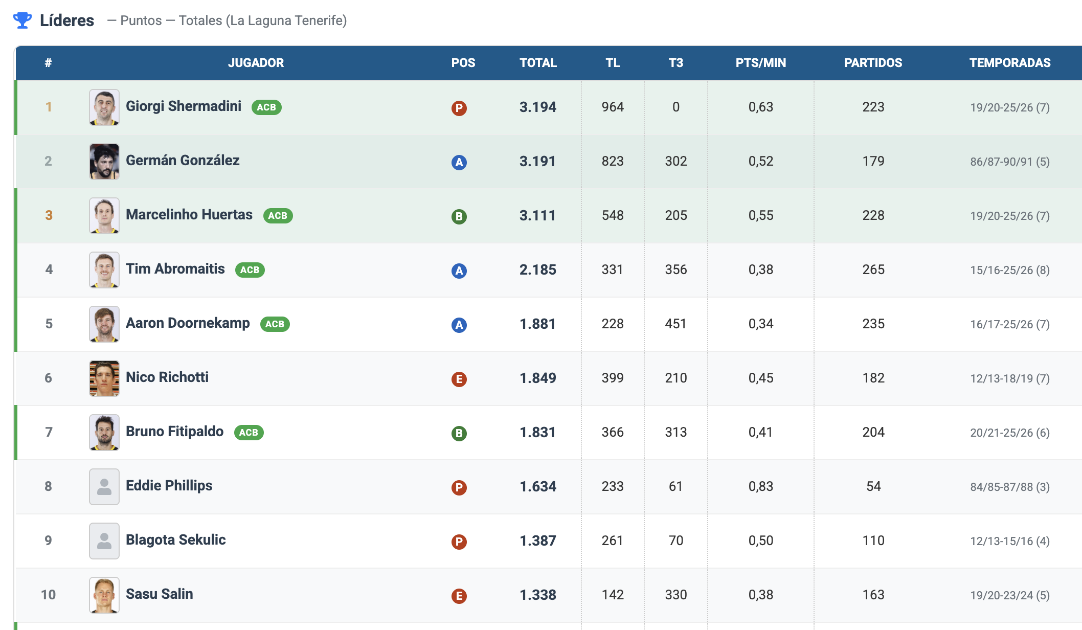 Este hito del CB Canarias 1939 coincide además con el día en que Gio Shermadini se ha convertido en el 40º jugador en la historia en sumar 5.000 puntos anotados en ACB. El georgiano lo ha conseguido en 372 partidos repartidos entre Zaragoza, Andorra, Málaga y La Laguna y se coloca como el 23º con menos partidos para alcanzar este hito anotador, justo por detrás de José Biriukov (364) y por delante de Juan Carlos Navarro (390).